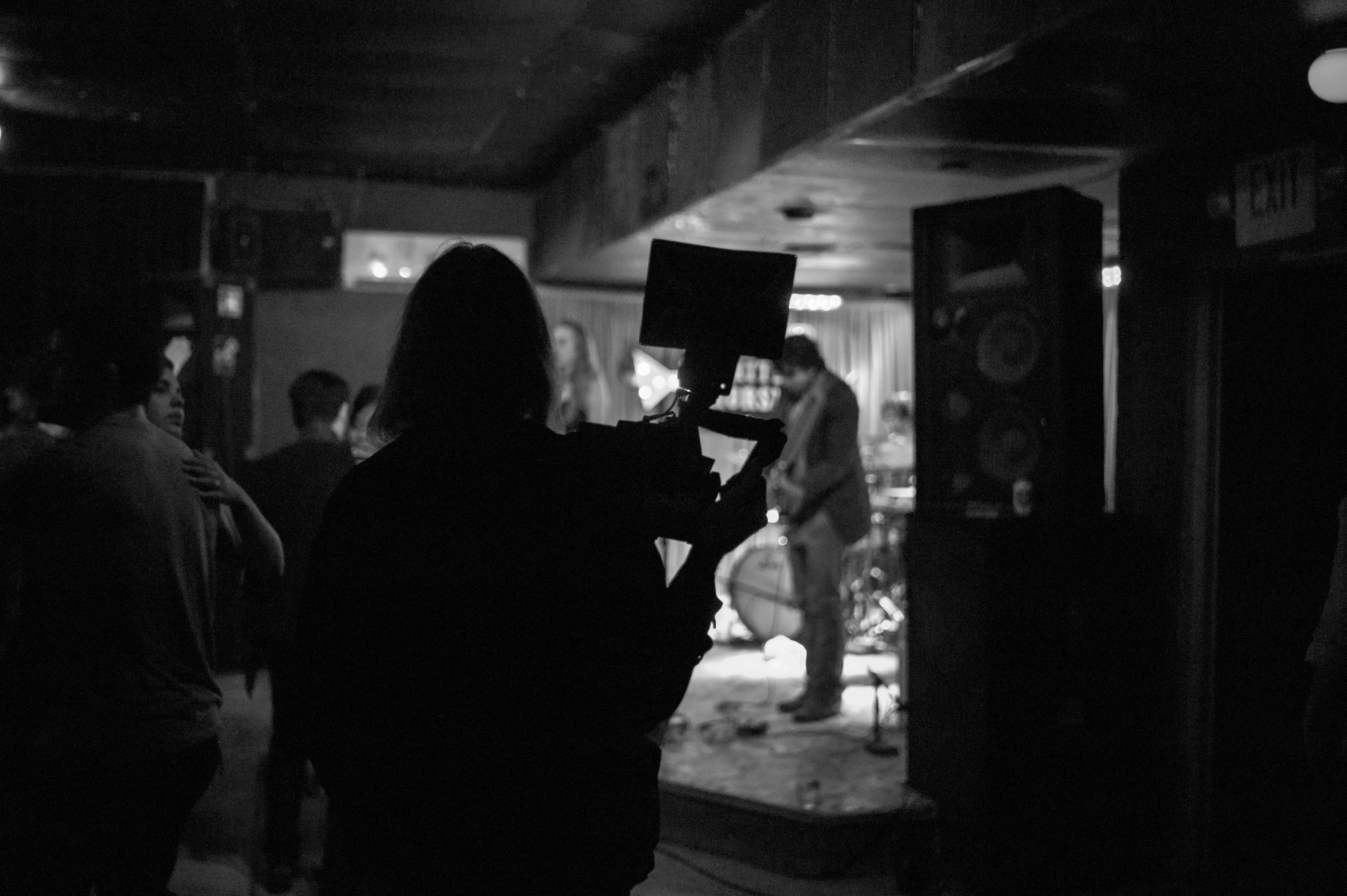 In a dimly lit venue, a silhouette of a person holds a camera, poised to document the electrifying atmosphere of a live music performance. The contrasting shadows and soft focus on the band create a sense of intimacy and anticipation, immersing the viewer in the energy of the moment. The monochromatic palette enhances the gritty, raw vibe of the scene, evoking feelings of nostalgia and passion for music and artistry.