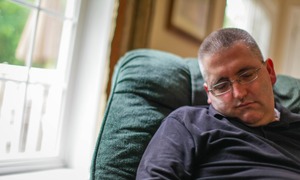 A man sits in a cozy green armchair, his head bowed in quiet reflection. Soft, natural light filters through a window, casting gentle shadows that enhance the serene mood of the scene. The composition, focused on the figure in profile, evokes a sense of introspection and calm amidst a warm, inviting environment.