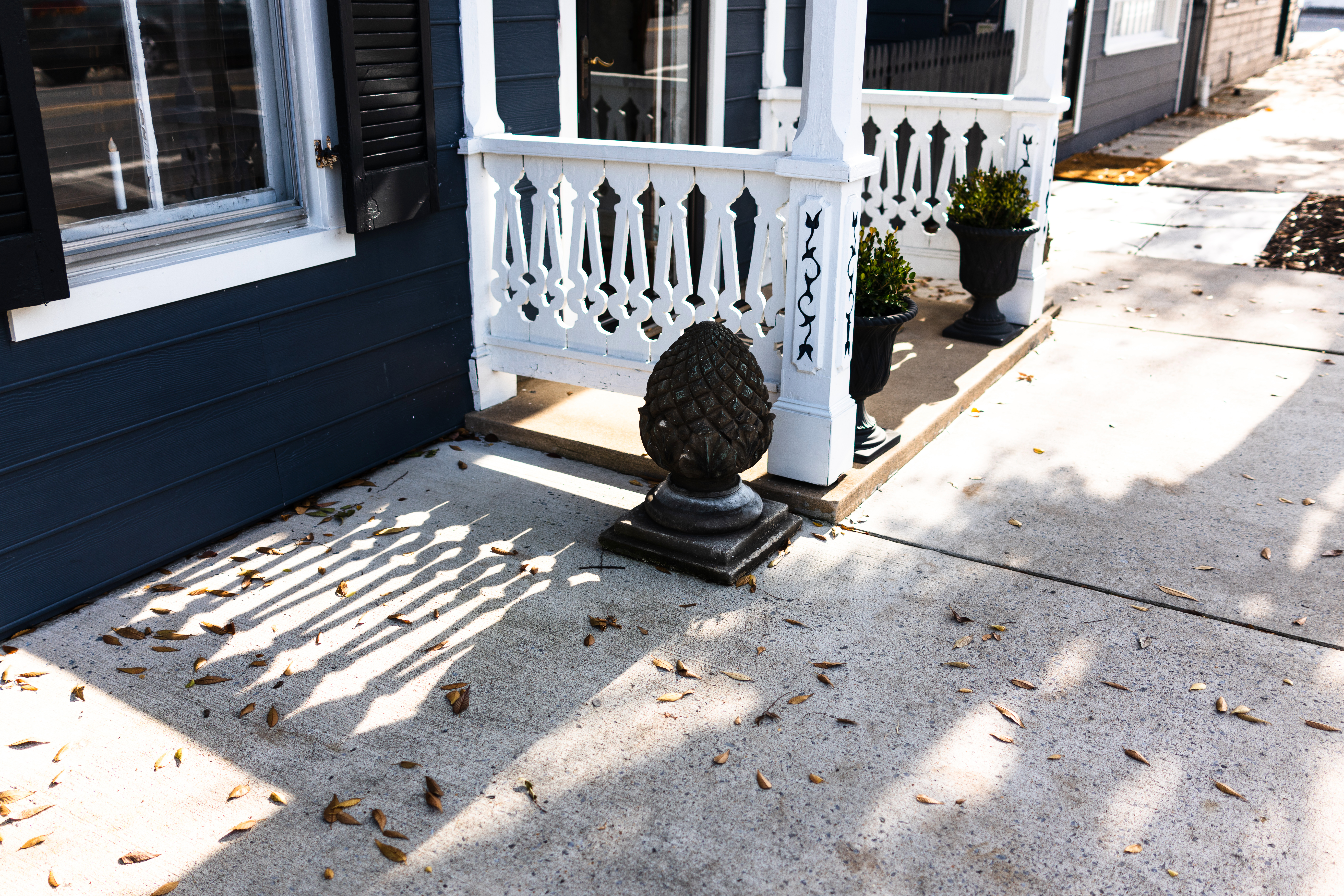 This photograph captures the intricate interplay of light and shadow on a quaint porch, featuring a decorative pineapple statue as its focal point. The soft sunlight casts elongated shadows across the concrete, while scattered autumn leaves add a touch of nostalgia to the scene. The contrasting colors of the dark blue wall and the white railing enhance the inviting yet serene atmosphere.
