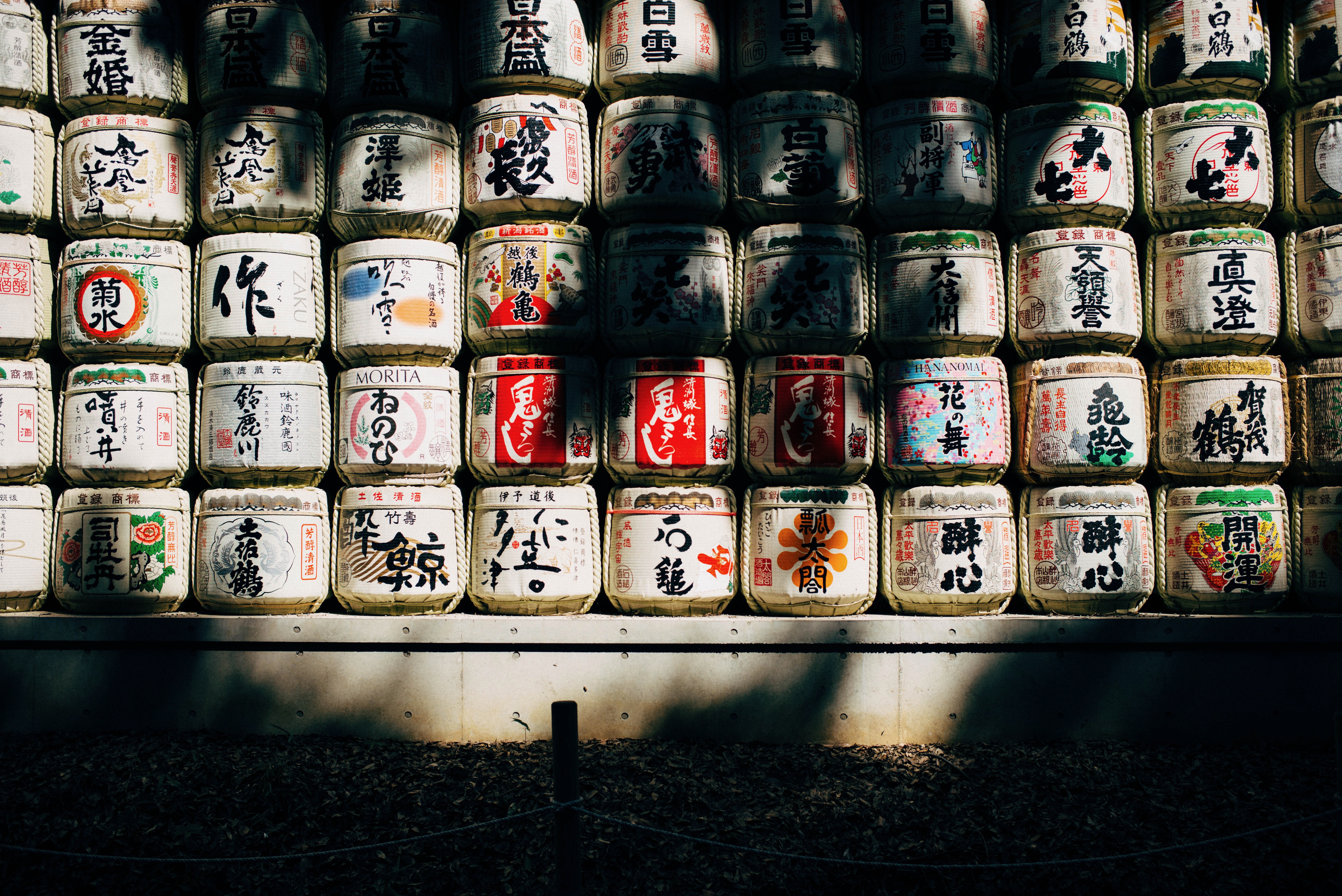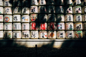 This photograph captures a striking wall of sake barrels, each adorned with colorful labels that tell a story of tradition and craftsmanship. The interplay of light and shadow creates a dramatic atmosphere, enhancing the depth and texture of the barrels, while the earthy tones of the surroundings evoke a sense of reverence and tranquility. It's a moment frozen in time, reflecting the rich cultural heritage it represents.
