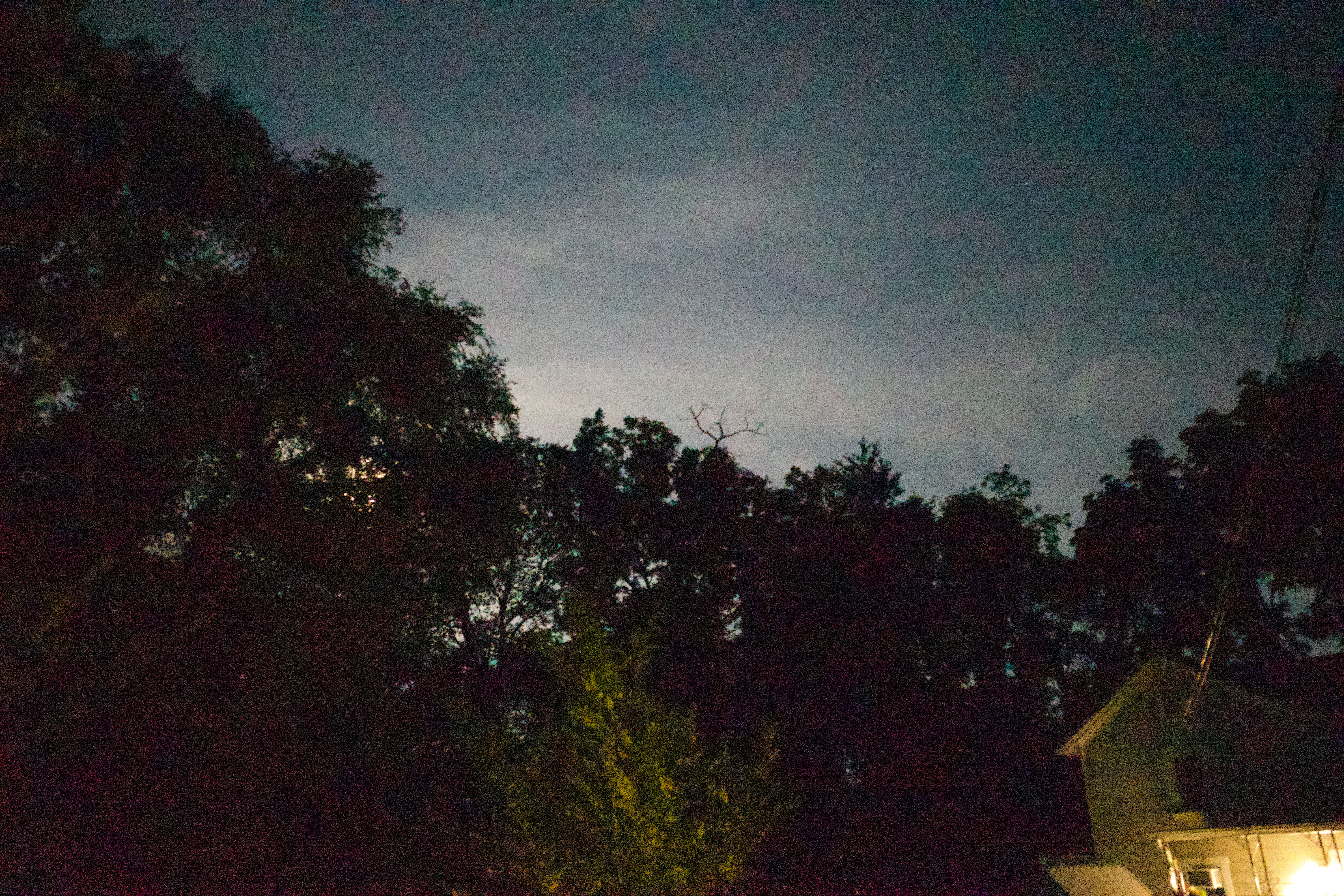 The photograph captures a night scene where dense trees loom against a gradually lightening sky, hinting at the approach of dawn. The mood is serene yet slightly eerie, with shadows cast by the foliage creating a sense of mystery. A dim glow from a nearby house adds warmth, contrasting with the cool tones of the sky and foliage.