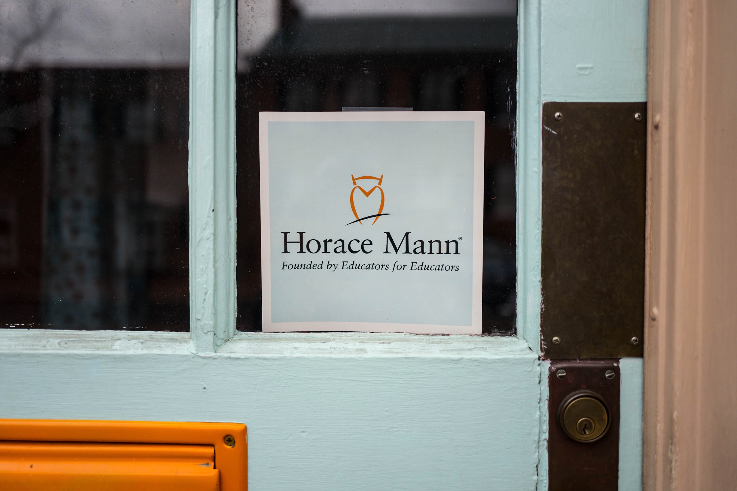 A close-up shot of a door featuring a prominent sign for Horace Mann, resonating with a sense of learning and community. The soft, muted colors of the door create a calm, inviting mood, while the clean lines of the composition emphasize the importance of education. Natural light gently illuminates the scene, enhancing the welcoming atmosphere of the entrance.