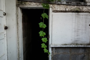 A solitary vine drapes gracefully from the edge of a doorway, contrasting the stark, abandoned structure of the building. The interplay of light and shadow creates a haunting yet serene mood, evoking a sense of nature reclaiming its space. The peeling paint and worn textures add to the feeling of neglect, while the vibrant green leaves offer a glimmer of life amidst the decay.