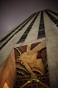 A monumental figure looms over the viewer, its stylized form illuminated against the evening sky. The upward perspective emphasizes the skyscraper's imposing height, while the warm tones of the artwork contrast with the cool shadows of the building. The overall mood is one of awe and contemplation, inviting reflection on wisdom and knowledge as embodied by the figure.
