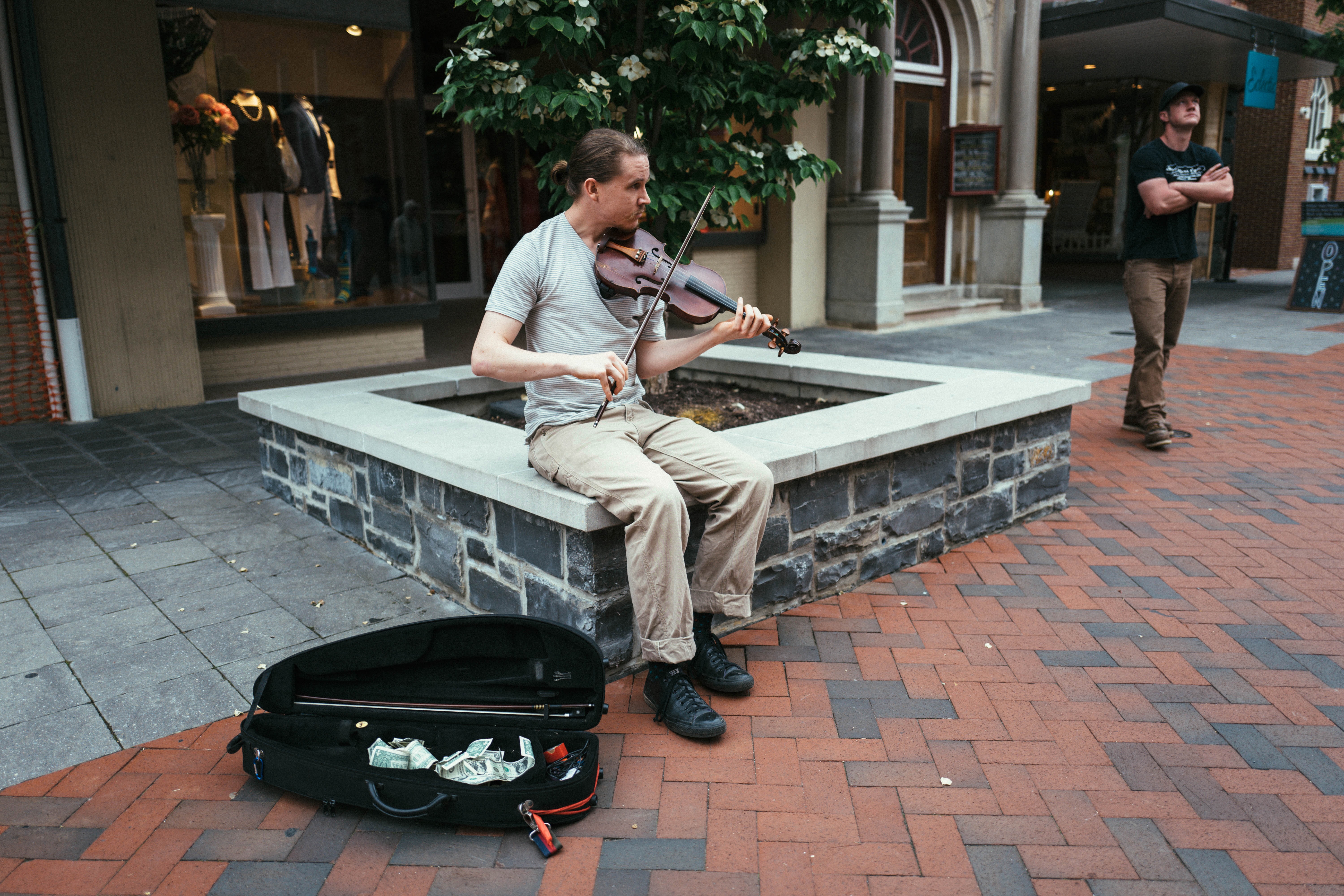 A musician plays the violin with earnest concentration on a bustling street, seated near a small fountain. The surrounding atmosphere is infused with a delicate blend of creativity and urban life, highlighted by the warm glow of evening light and the casual presence of passersby. Dollar bills spill from his open case, hinting at the audience's appreciation for his talent.