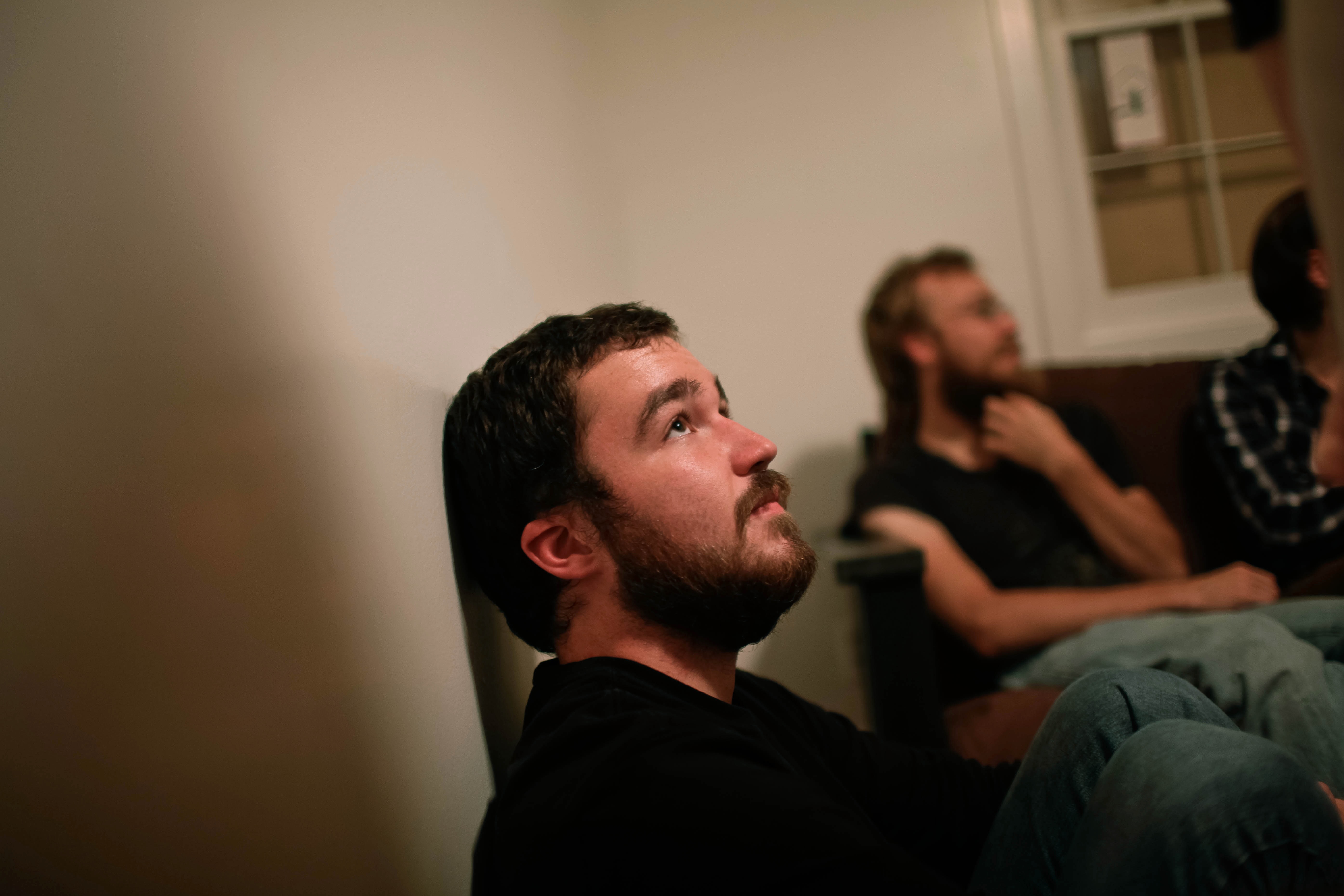 In a softly lit room, a young man gazes upward, his expression filled with thoughtfulness and contemplation. The blurred figures of others in the background suggest a quiet gathering, enhancing the intimate and reflective mood of the scene. The warm lighting casts gentle shadows, creating a cozy yet introspective atmosphere that invites viewers to ponder what lies beyond the visible.