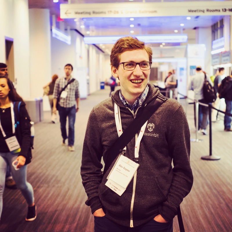 In a bustling conference hallway, a young man radiates warmth with a bright smile, creating a welcoming atmosphere amidst the busy backdrop. The composition captures him in the foreground, framed by attendees moving in various directions, while soft, diffused lighting enhances the lively yet focused ambiance. His casual attire and conference badge suggest engagement and enthusiasm, embodying the spirit of networking and sharing ideas.