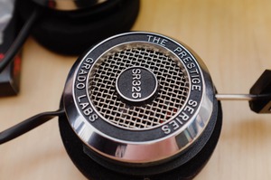 This close-up photograph captures the intricate details of a Grado SR325 headphone, highlighting its sleek metallic mesh and polished finish. The warm ambient lighting creates a cozy mood, inviting the viewer to appreciate the craftsmanship and design of this audio gear. Soft shadows enhance the composition, focusing attention on the headphone's emblematic branding.