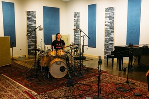 A young drummer sits behind a gleaming set of drums, illuminated by soft, diffused lighting that casts a warm glow over the room. The studio's modern yet cozy aesthetic features blue acoustic panels and a richly patterned rug, creating an inviting atmosphere for creativity. The mood is focused and vibrant, capturing a moment of artistic preparation and potential.
