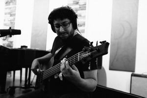 In a dimly lit recording studio, a focused musician strums a bass guitar, immersed in his craft. The warm, muted tones and soft shadows create an intimate atmosphere, emphasizing the dedication and passion infused in each note. His headphones suggest a sonic world that connects him to the music, while he remains anchored in the moment with an intense expression of concentration.