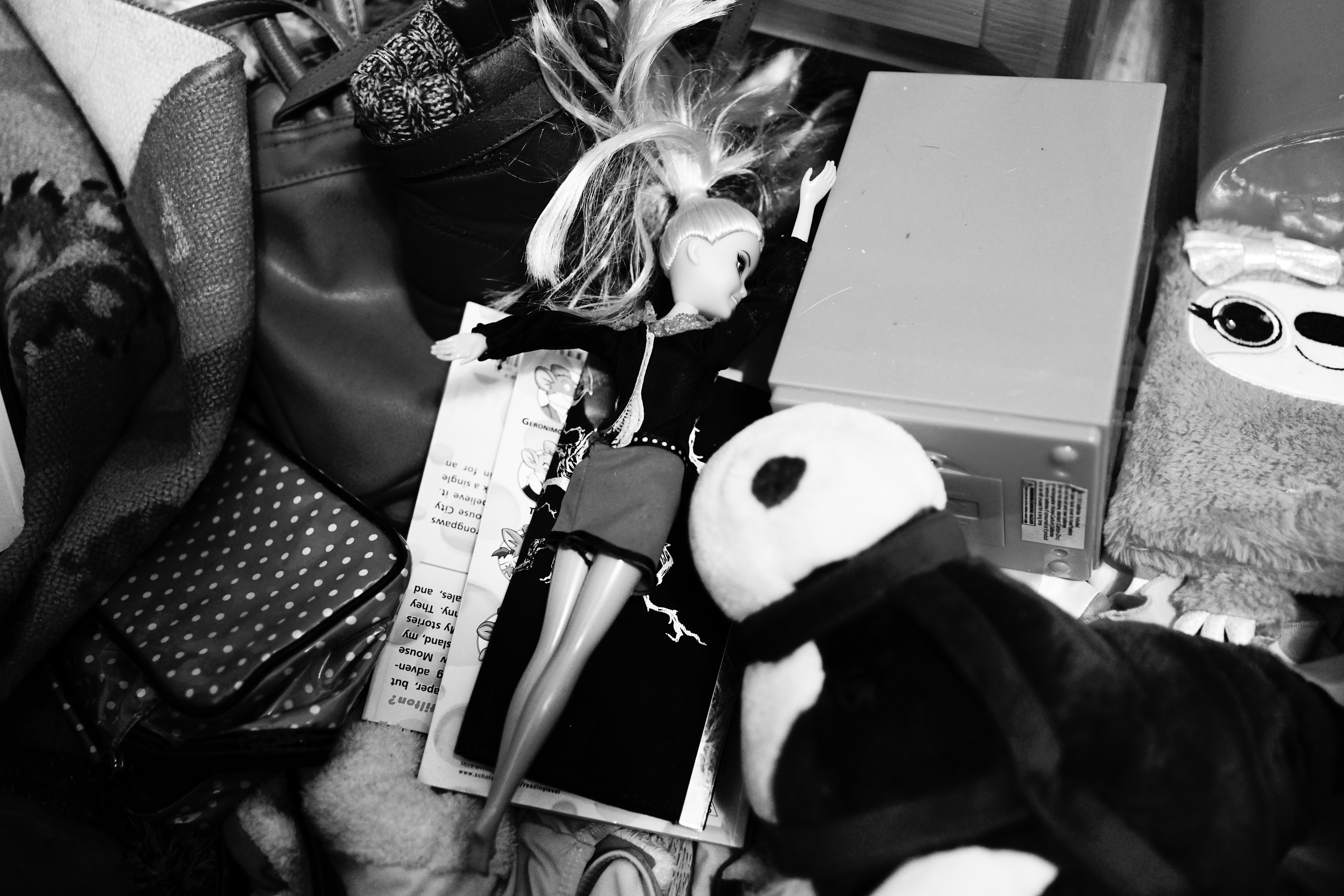 This black-and-white photograph captures a cluttered assortment of toys, centering on a doll lying amid chaos, her arm outstretched as if in a moment of surrender. The disarray evokes feelings of nostalgia and lost innocence, illuminating the remnants of childhood play. Soft lighting subtly highlights the textures and shapes, creating a melancholic mood that invites reflection on the passage of time.