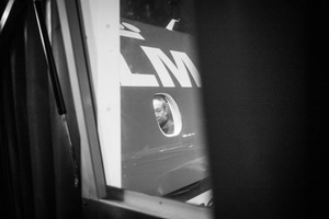 A solitary figure peers through the window of a bus, illuminated by the stark contrast of night. The monochrome palette evokes a sense of quiet reflection, while the framing creates an intimate glimpse into the moment. The composition draws the eye to the subtle expressions, hinting at thoughts of travel and transition.