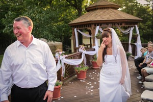 In a sunlit outdoor gazebo, a joyful couple shares a light-hearted moment during their wedding ceremony. The groom's laughter contrasts with the bride's playful demeanor, creating a warm and intimate atmosphere, enhanced by soft, diffused lighting filtering through the trees. Guests watch from the sidelines, adding to the celebration's vibe, surrounded by floral decorations and scattered petals on the wooden deck.