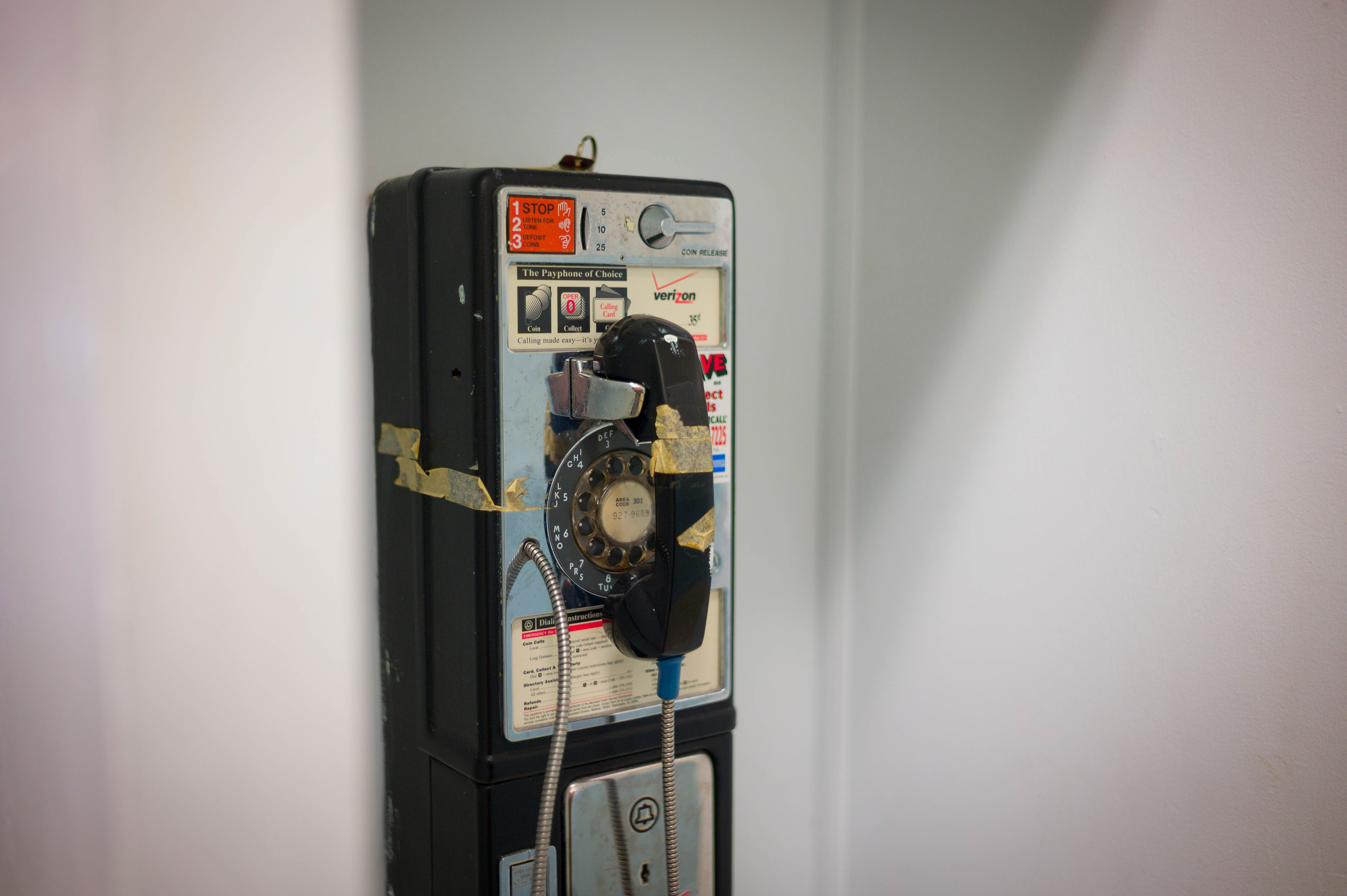 A solitary payphone stands against a minimalist wall, adorned with faded stickers and remnants of yellow tape, suggesting a time gone by. The soft, diffused lighting casts gentle shadows, enhancing the phone’s vintage charm and evoking a sense of nostalgia. Its isolation in the space speaks to the evolution of communication in a modern world.