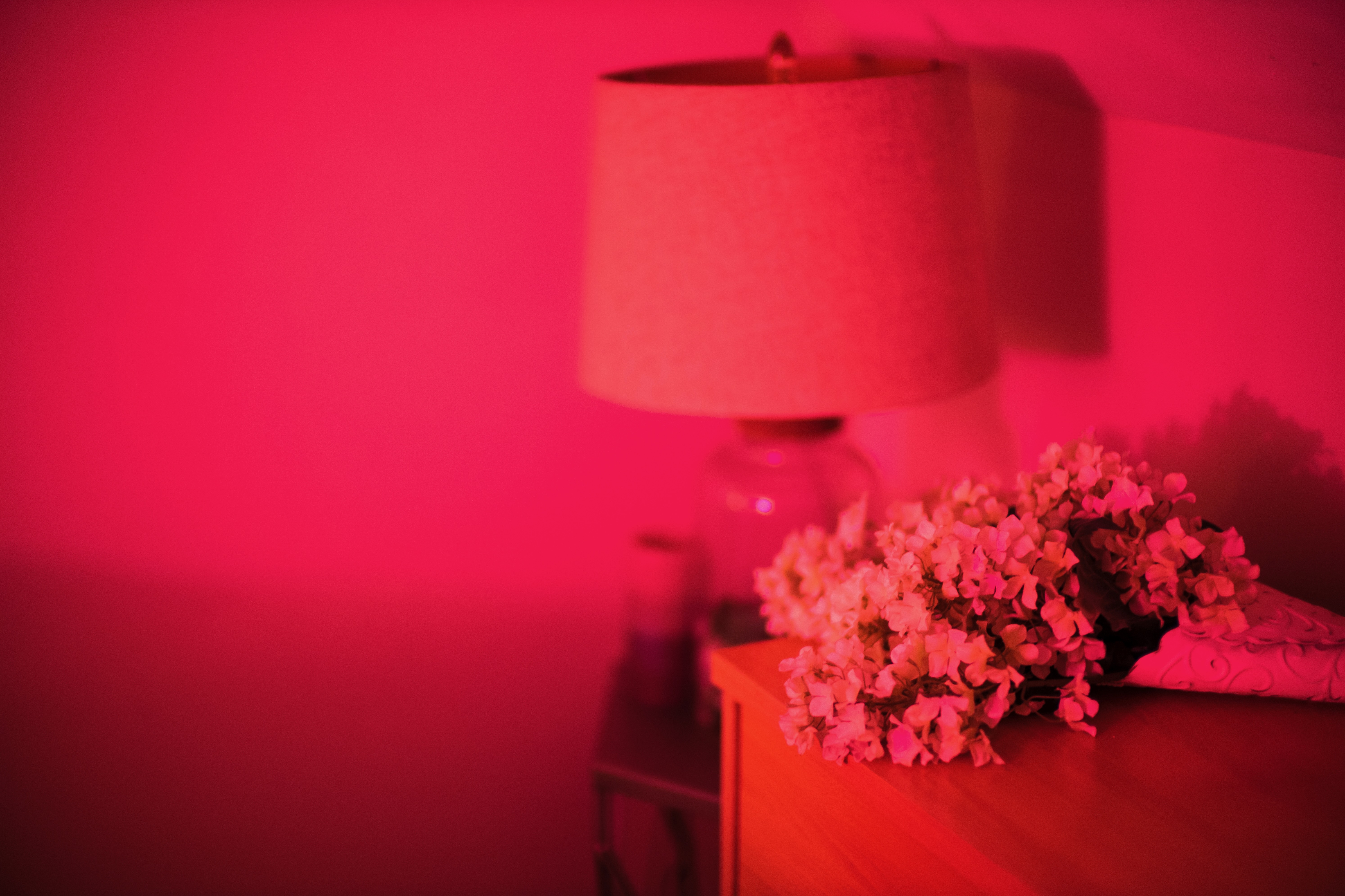 Bathed in a warm, pink light, this intimate scene showcases a lamp casting a gentle glow over a bedside table adorned with a bouquet of delicate flowers. The composition creates a mood of tranquility and calm, inviting the viewer into a personal space filled with soft textures and hues. The interplay of light and shadow enhances the cozy atmosphere, making it feel both serene and inviting.