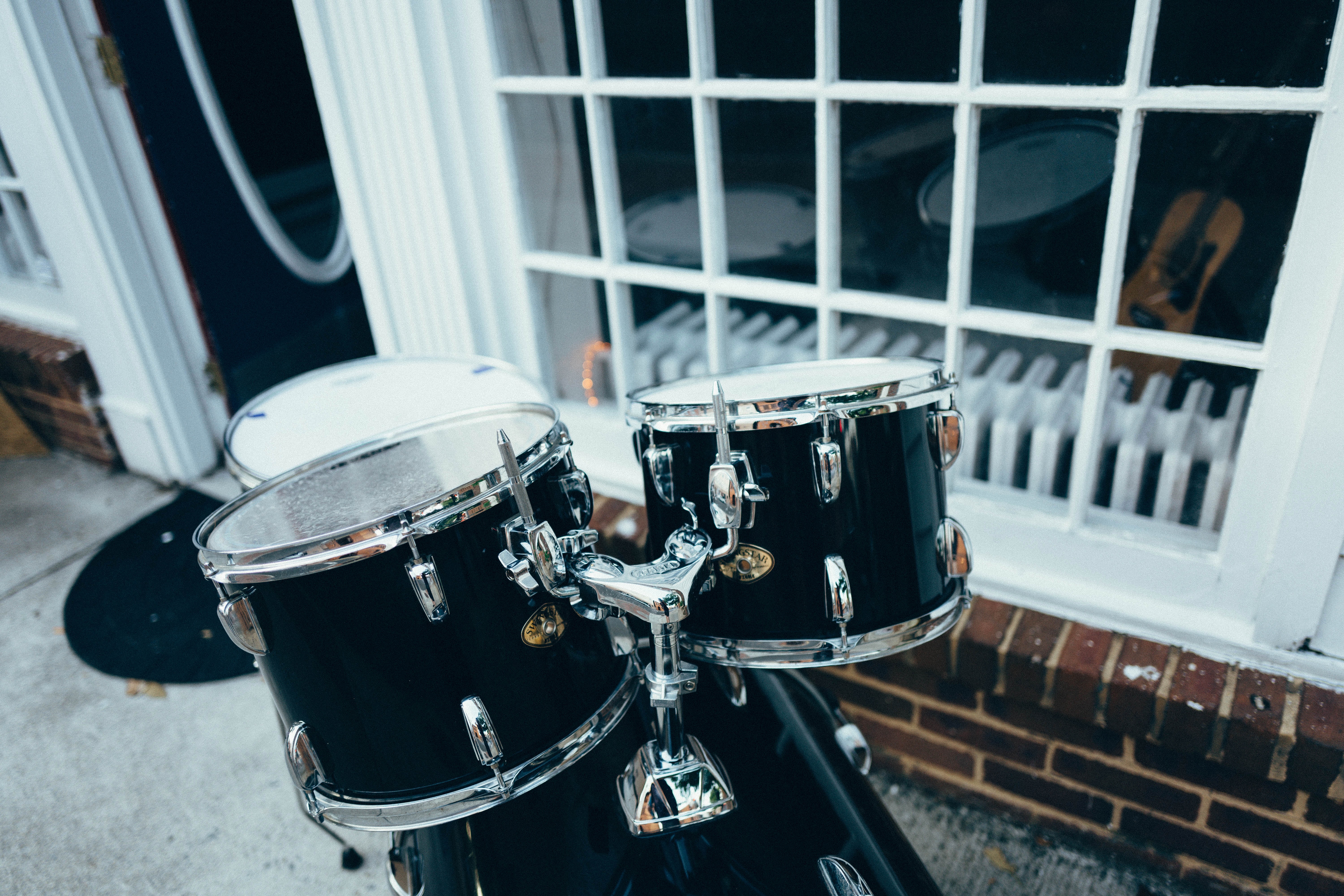 An intimate glimpse of a black drum set rests outside a venue, illuminated by soft, natural light filtering through nearby windows. The juxtaposition of the polished chrome and deep black contrasts with the warm tones of the brick and ambient surroundings, creating a nostalgic mood. The scene evokes a sense of anticipation, hinting at the music that once filled the air and the stories waiting to unfold within those walls.