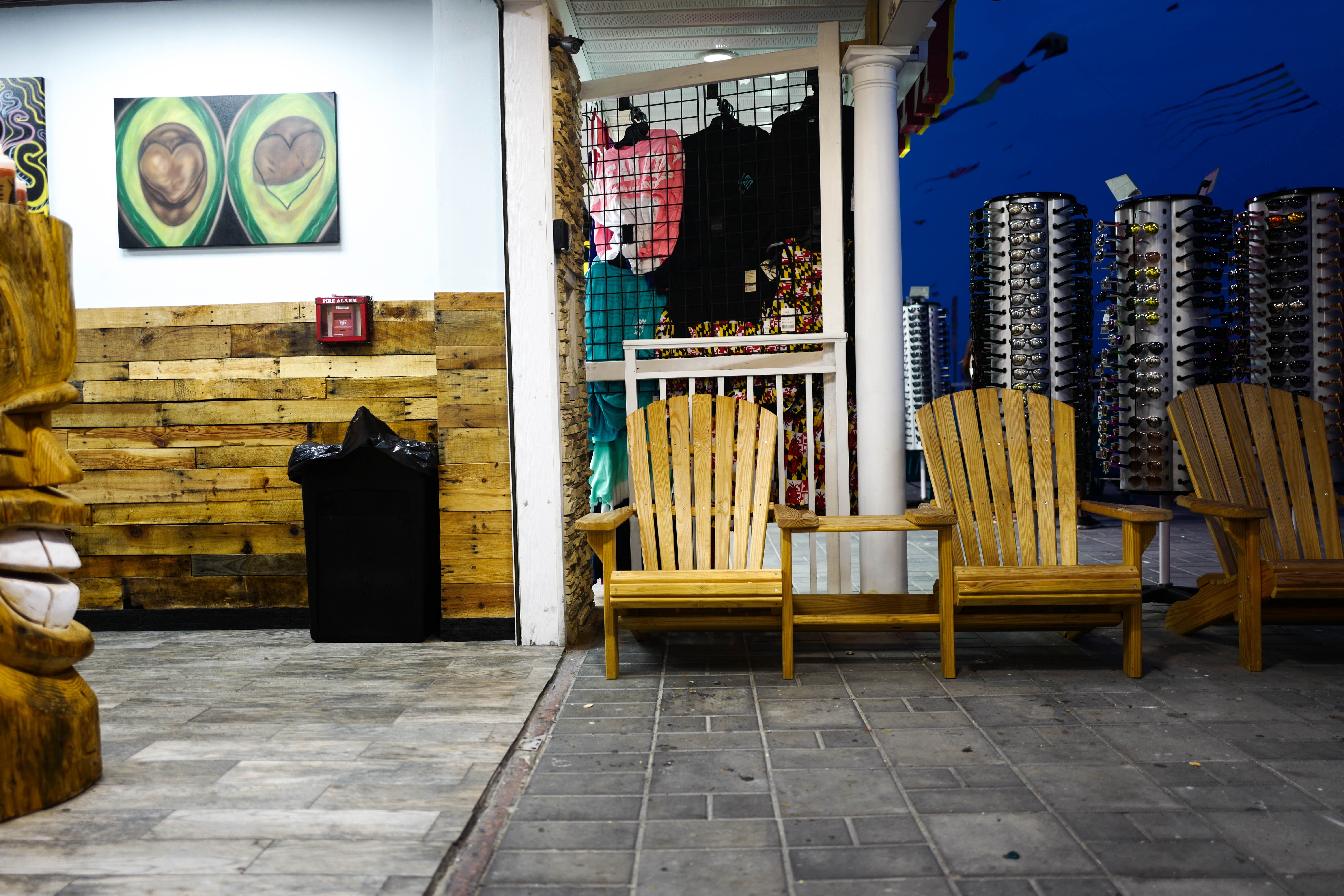 The photograph captures a cozy, inviting corner with wooden chairs set against a backdrop of vibrant art and colorful clothing displays. The warm wood tones and soft lighting create a relaxed atmosphere, suggesting a tranquil escape from the bustling surroundings. A hint of tropical flair is further emphasized by the decor and distant shadows, hinting at a lively environment just out of view.
