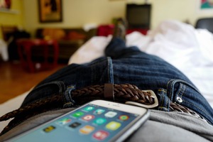 The photograph captures a relaxed scene from the perspective of a person lying on a bed, with their jeans-clad legs stretching out towards the viewer. A smartphone rests on the lap, hinting at a moment of leisure and connectivity amidst a cozy, slightly cluttered room, where soft lighting creates a warm ambiance.