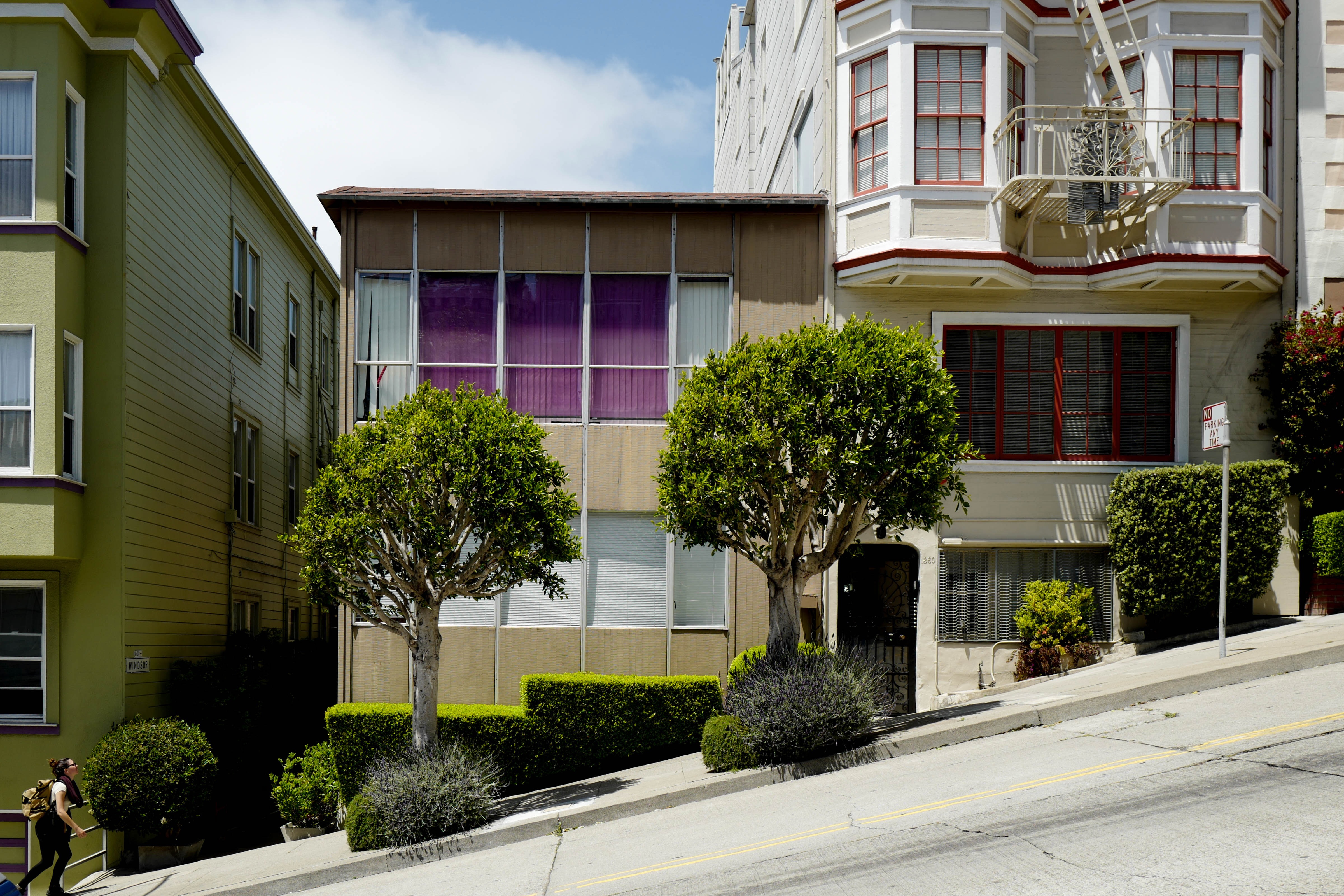 This photograph captures a quirky intersection of architecture on a steep hillside, showcasing a blend of modern and classic elements. The vibrant facade of the house contrasts sharply with the muted tones of its neighbors, while the neatly trimmed bushes add a touch of nature to the urban scene. Bathed in bright, natural light, the composition evokes a sense of playfulness and charm amid the city’s hustle.