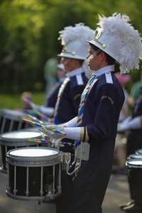 In a vibrant display of rhythm and precision, marching drummers stand poised in their uniforms adorned with feathers and emblems. The warm lighting casts a gentle glow, enhancing the focus on their concentrated expressions and intricate movements. The blurred background captures the energy of the parade, evoking a sense of celebration and camaraderie.