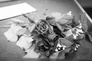 In this monochromatic scene, a cluster of artificial roses rests delicately on a surface, suggesting a fleeting moment of beauty. The soft lighting casts gentle shadows, enhancing the intricate details of the petals and leaves, evoking a sense of nostalgia and quiet reflection. The composition feels serene and contemplative, drawing the viewer into the calmness of the moment.
