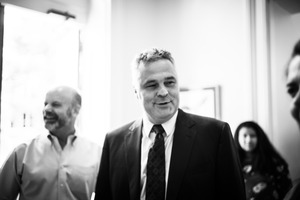 In this black and white photograph, a well-dressed man engages in conversation, a slight smile on his face, suggesting a moment of connection. The soft, natural light filtering through an open door casts gentle shadows, enhancing the intimate mood of the gathering. In the background, a few other figures add layers to the composition, creating a sense of lively interaction among friends or colleagues.