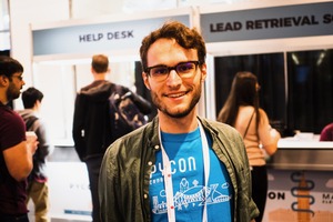 A cheerful individual stands confidently in the foreground, wearing a bright PyCon t-shirt, exuding a sense of camaraderie and enthusiasm. The backdrop showcases a busy conference scene, with people engaged in conversation, hinting at a collaborative atmosphere. Soft lighting highlights the subject's warm smile, creating an inviting and friendly mood.