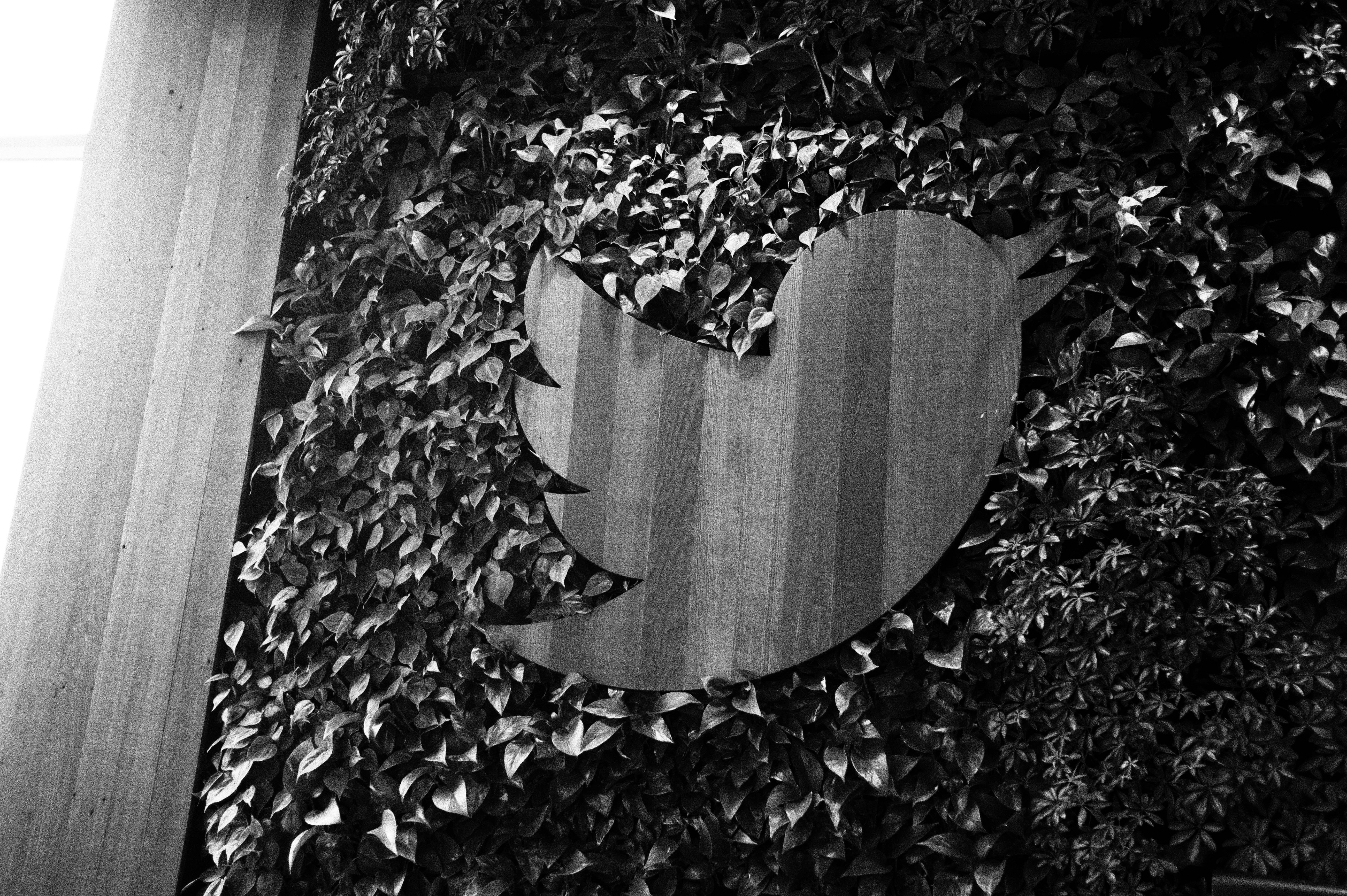 The photograph captures a striking contrast between the organic forms of lush greenery and the polished wood of the Twitter logo, embodying a harmonious blend of nature and technology. The monochrome palette adds a touch of nostalgia, while soft lighting accentuates the textures of the leaves and the logo, creating a serene and contemplative mood. This composition invites viewers to reflect on the intersection of digital communication and the natural world.
