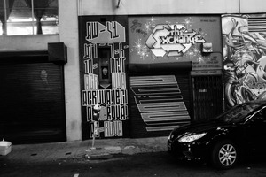 This black-and-white photograph captures a gritty urban scene adorned with eclectic graffiti art on building exteriors. The stark contrasts and bold lettering create a dynamic interplay of shapes and textures, evoking a sense of street culture and artistic rebellion. A parked car in the foreground adds an everyday element, grounding the vibrant visuals in the reality of city life.