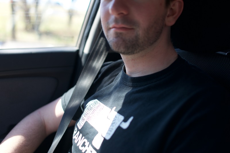 A close-up captures a contemplative moment of a man sitting in a car, partially illuminated by soft, natural light filtering through the window. The focus on his relaxed demeanor and the contrast of the dark shirt against the bright surroundings creates an intimate and reflective mood. The composition highlights the interplay of light and shadow, evoking a sense of quiet connection with the world outside.