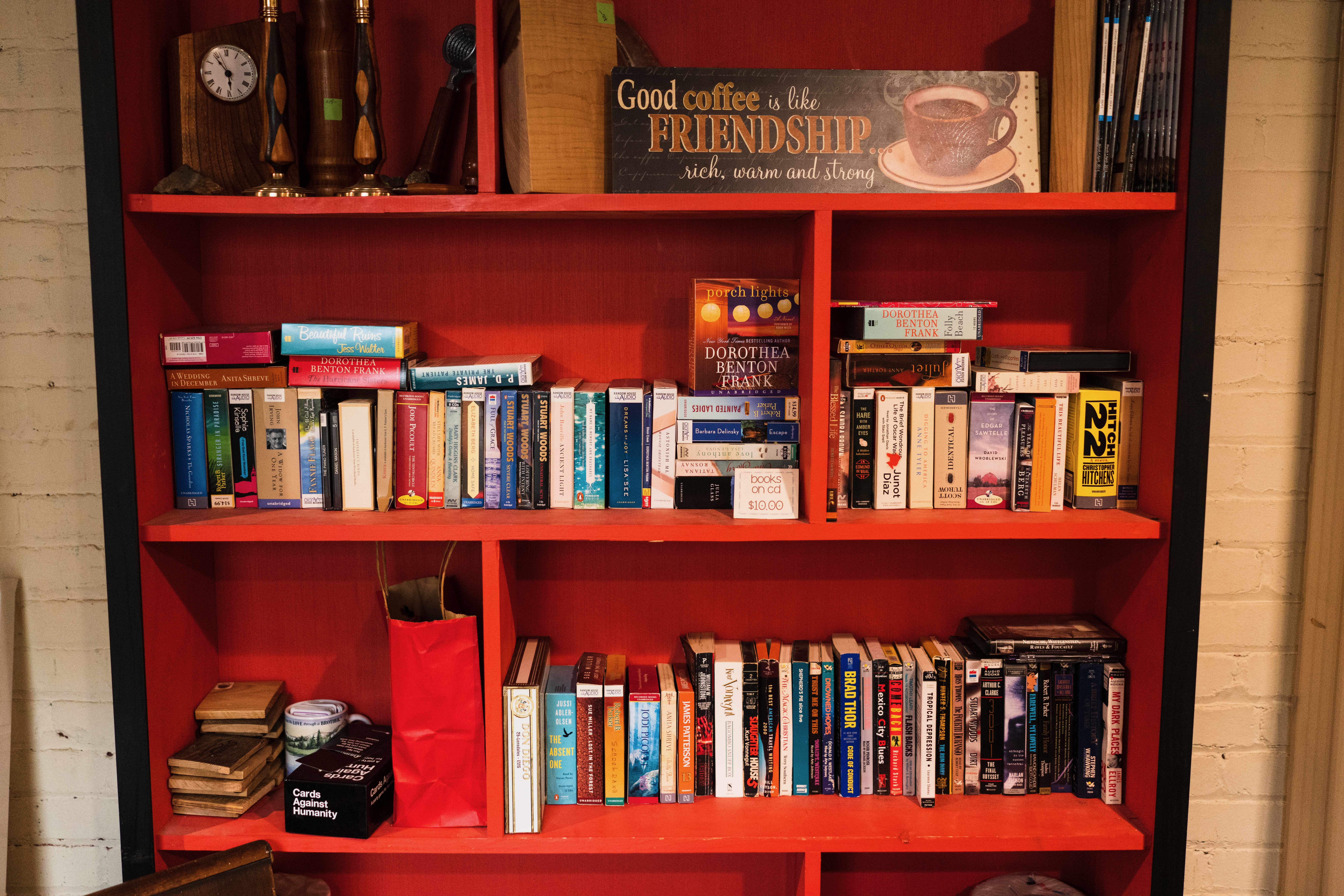This photograph showcases a vibrant red bookshelf filled with an eclectic mix of books, evoking a sense of warmth and nostalgia. The arrangement is casual and inviting, with a playful sign above that captures the essence of friendship and good coffee. The lighting is soft, enhancing the cozy atmosphere of this literary corner, perfect for quiet reading moments.