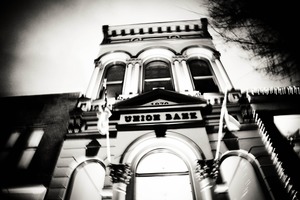 This striking black-and-white photograph captures the Union Bank's ornate facade, slightly blurred to convey a sense of motion and nostalgia. The composition emphasizes the building's intricate architectural details along with a hint of mystery, enhanced by low evening light. The mood is both haunting and timeless, inviting the viewer to reflect on the passage of time.