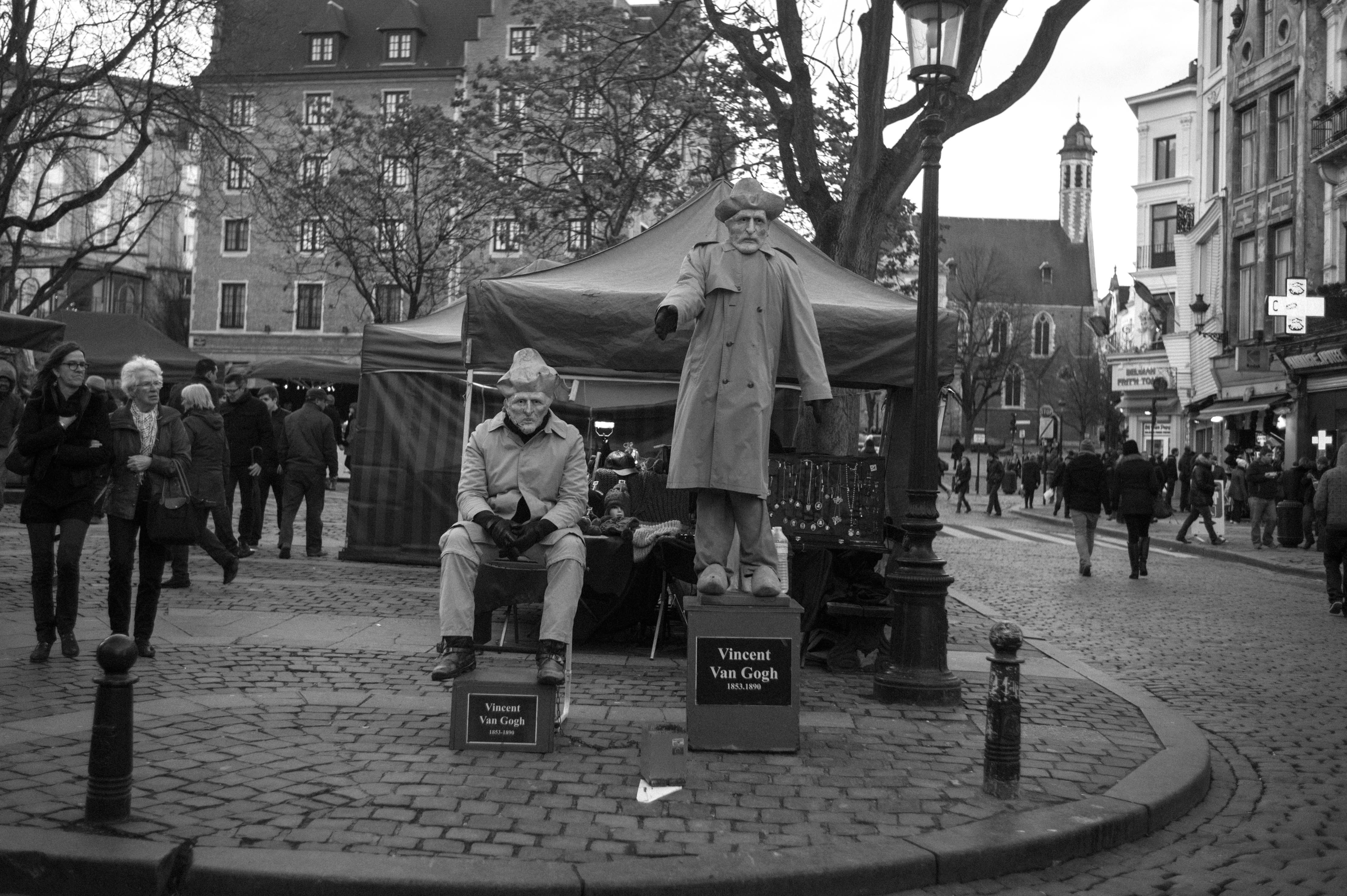 In a bustling street scene, two performers dressed as Vincent Van Gogh evoke a sense of artistry and nostalgia through their stillness amid the lively atmosphere. The monochromatic palette adds a touch of somberness, while the rich textures of the cobblestones and background architecture frame the mood. Soft, natural light filters through the trees, casting gentle shadows that enhance the ambiance of this artistic tableau.