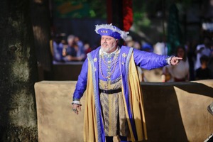In this vibrant scene, a performer dressed in elaborate royal attire passionately gestures, commanding attention from the audience. The rich colors and intricate details of his costume contrast beautifully with the warm sunlight filtering through the trees, creating a lively and engaging atmosphere. The expressions of onlookers hint at their fascination, enhancing the overall mood of theatrical celebration.