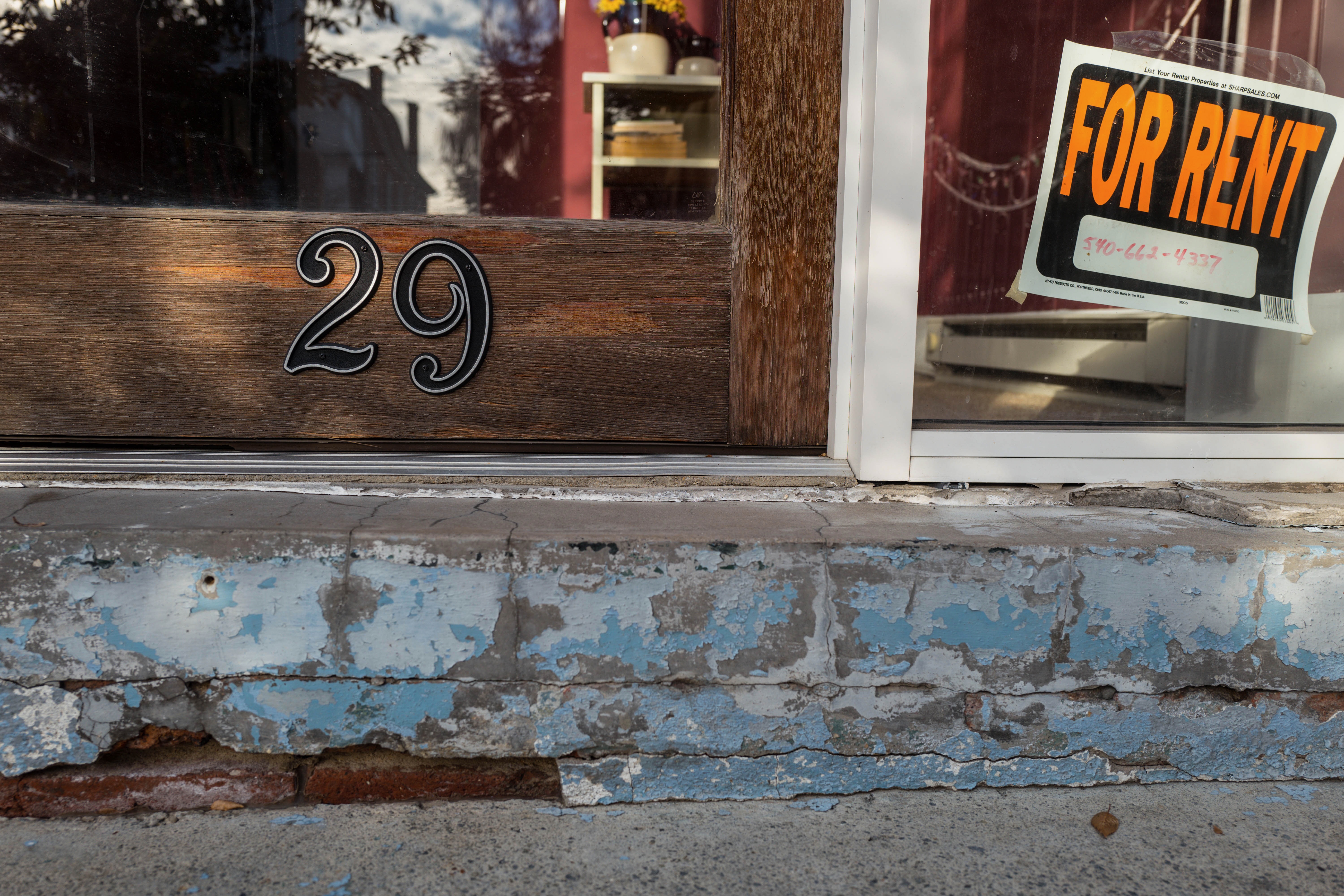 The photograph captures the weathered entrance of a storefront marked 'For Rent,' with the distinct number 29 prominently displayed. The peeling blue paint on the concrete base and the soft, natural light evoke a sense of nostalgia and loss, suggesting a space once filled with life now yearning for new beginnings. The composition draws the eye downwards, emphasizing the contrast between the vibrant sign and the faded surroundings.