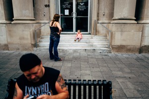In a bustling urban setting, a young girl sits innocently on the steps of a bank, her presence a stark contrast to the adult world around her. A woman stands nearby, casting a protective glance, while a man in the foreground appears absorbed in his own thoughts. The lighting captures the subtleties of the moment, highlighting the interaction of innocence and everyday life.