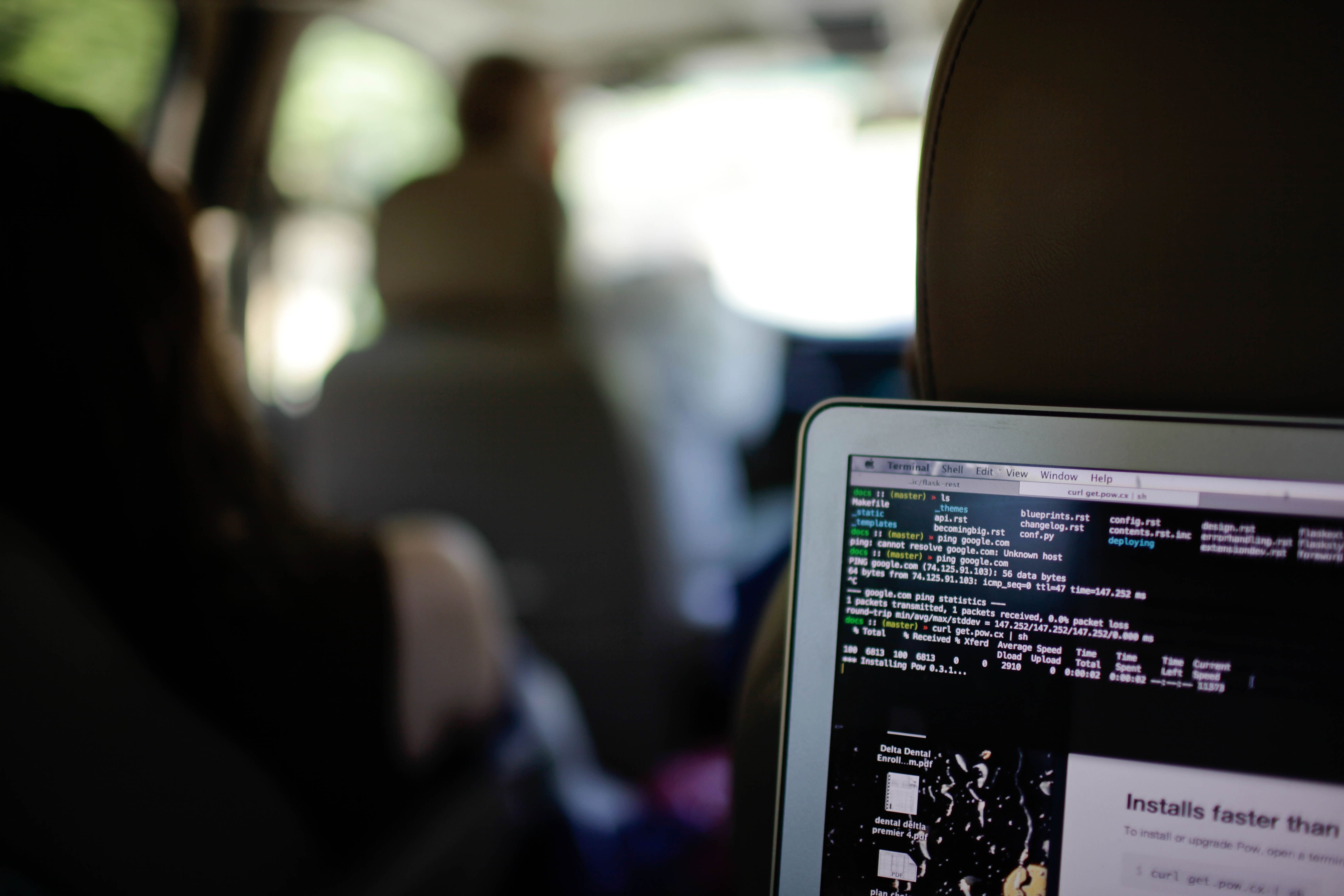 In a cozy van setting, the focus shifts from a laptop screen displaying coding tasks to the blurred figures of passengers in the background. The warm, diffused light filtering through the windows creates an intimate atmosphere, blending a sense of productivity with the experience of travel. This composition captures a moment of connection between technology and the journey itself, inviting contemplation on modern nomadism.
