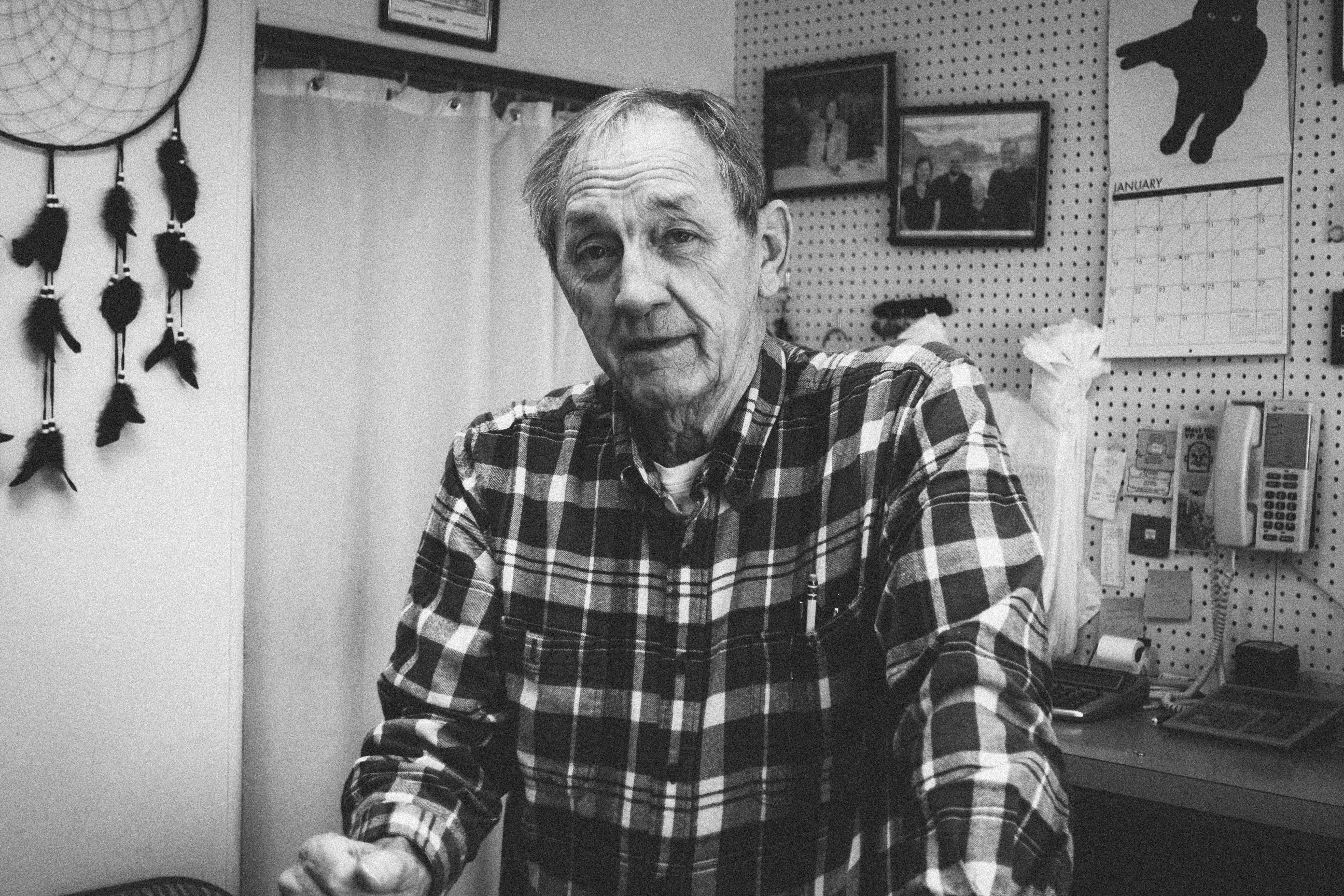 In this stark black-and-white portrait, an elderly man stands behind a counter, embodying years of experience and quiet resilience. The soft lighting casts gentle shadows on his face, highlighting deep lines that tell stories of a lifetime, while the rustic background adds an intimate, nostalgic atmosphere. His plaid shirt and contemplative expression evoke a sense of warmth and familiarity, inviting the viewer to connect with his unspoken narratives.
