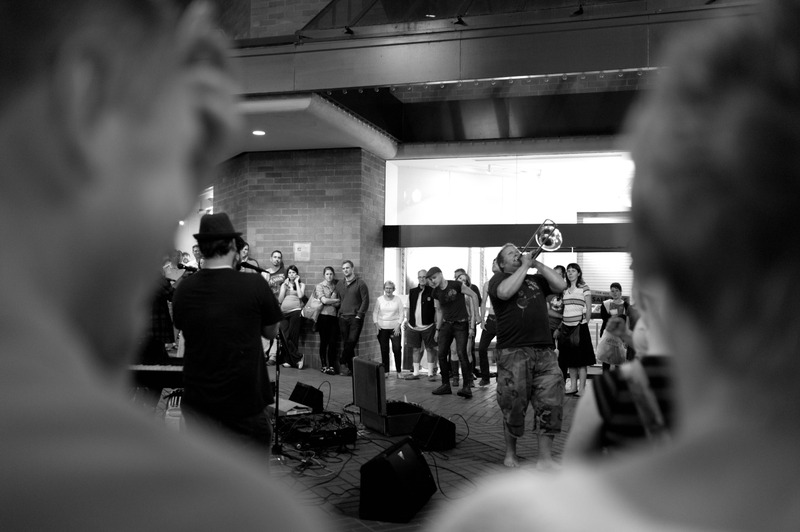 In a bustling urban setting, a musician passionately plays the trombone, drawing the attention of an engaged audience. The black and white composition emphasizes the energy of the performance and the intimate atmosphere created by the close proximity of onlookers. The interplay of light and shadow highlights the musician’s intense expression, while the blurred figures of the crowd lend a sense of movement and connection to the moment.