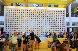 The photograph captures a vibrant interior space filled with a diverse crowd engaging with a striking wall of colorful circular displays. The bright yellow accents elevate the lively mood, inviting curiosity and interaction. The warm lighting enhances the joyful atmosphere, as people explore and connect amid the artful arrangement of colors.