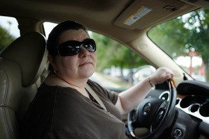 The photograph captures a woman seated in the driver's seat of a car, her expression thoughtful yet assertive. Wearing dark sunglasses, she gazes toward the viewer, exuding a sense of confidence and contemplation. Soft, natural light filters through the vehicle, highlighting her features and framing the greenery outside, creating an inviting and serene atmosphere.