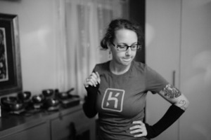 In this intimate black-and-white photograph, a woman stands contemplatively, hinting at a moment of introspection. The soft, natural light filters through sheer curtains, casting gentle shadows that enhance the mood of reflection. Her casual attire and tattoos add layers of character, inviting viewers to ponder her thoughts and story.