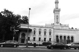 The photograph captures a striking mosque in a stark black and white palette, enhancing its architectural elegance. The soft lighting imbues the scene with a contemplative mood, while the surrounding greenery contrasts with the structured lines of the building. Cars pass by, underscoring the intersection of daily life and spiritual presence.