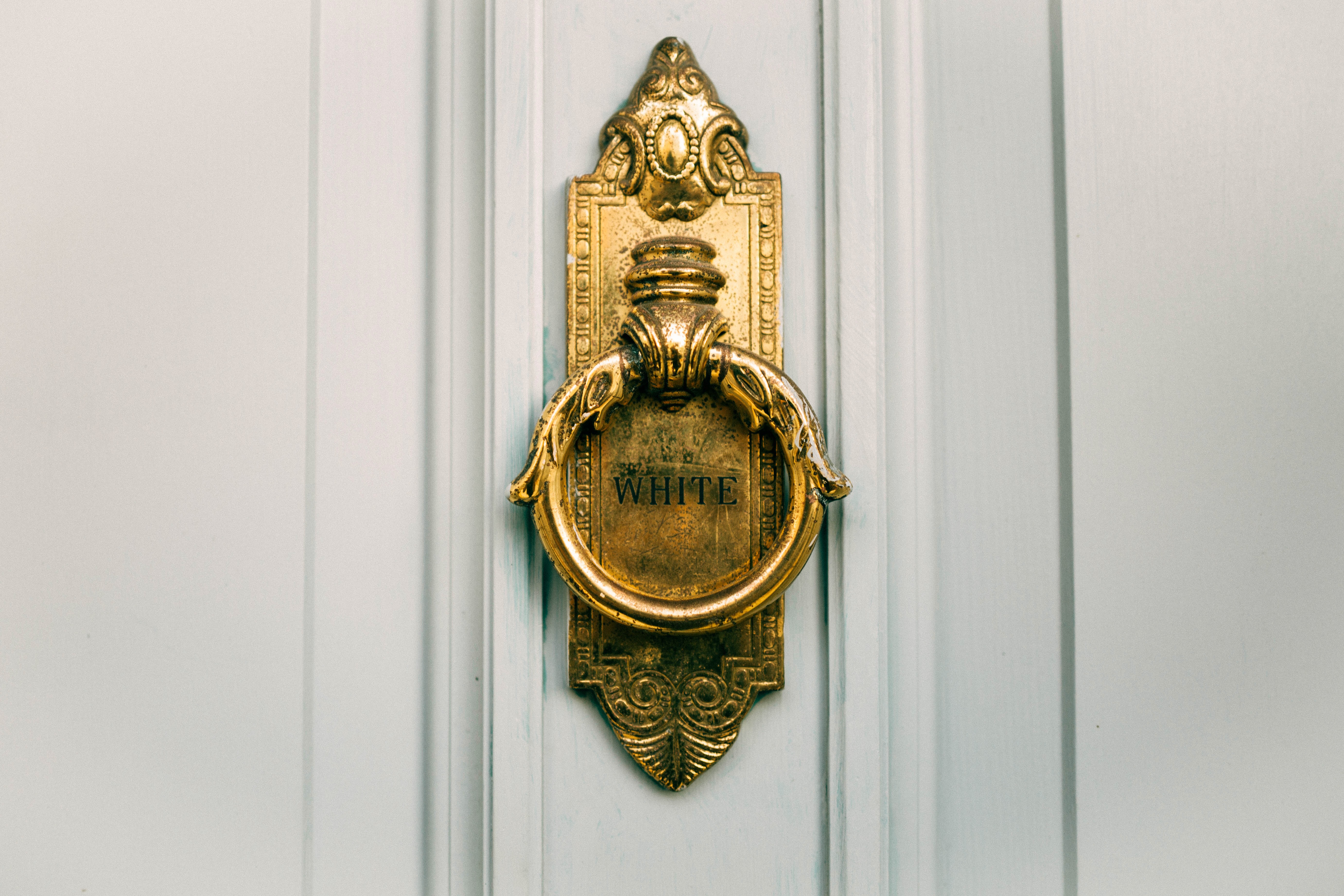 This photograph captures an ornate brass door knocker embossed with the name 'WHITE,' set against a serene, pale backdrop. The soft lighting accentuates the intricate details of the knocker, evoking a sense of elegance and inviting curiosity. The composition draws the viewer's eye directly to the striking contrast between the glimmering metal and the muted door, creating a harmonious yet intriguing focal point.