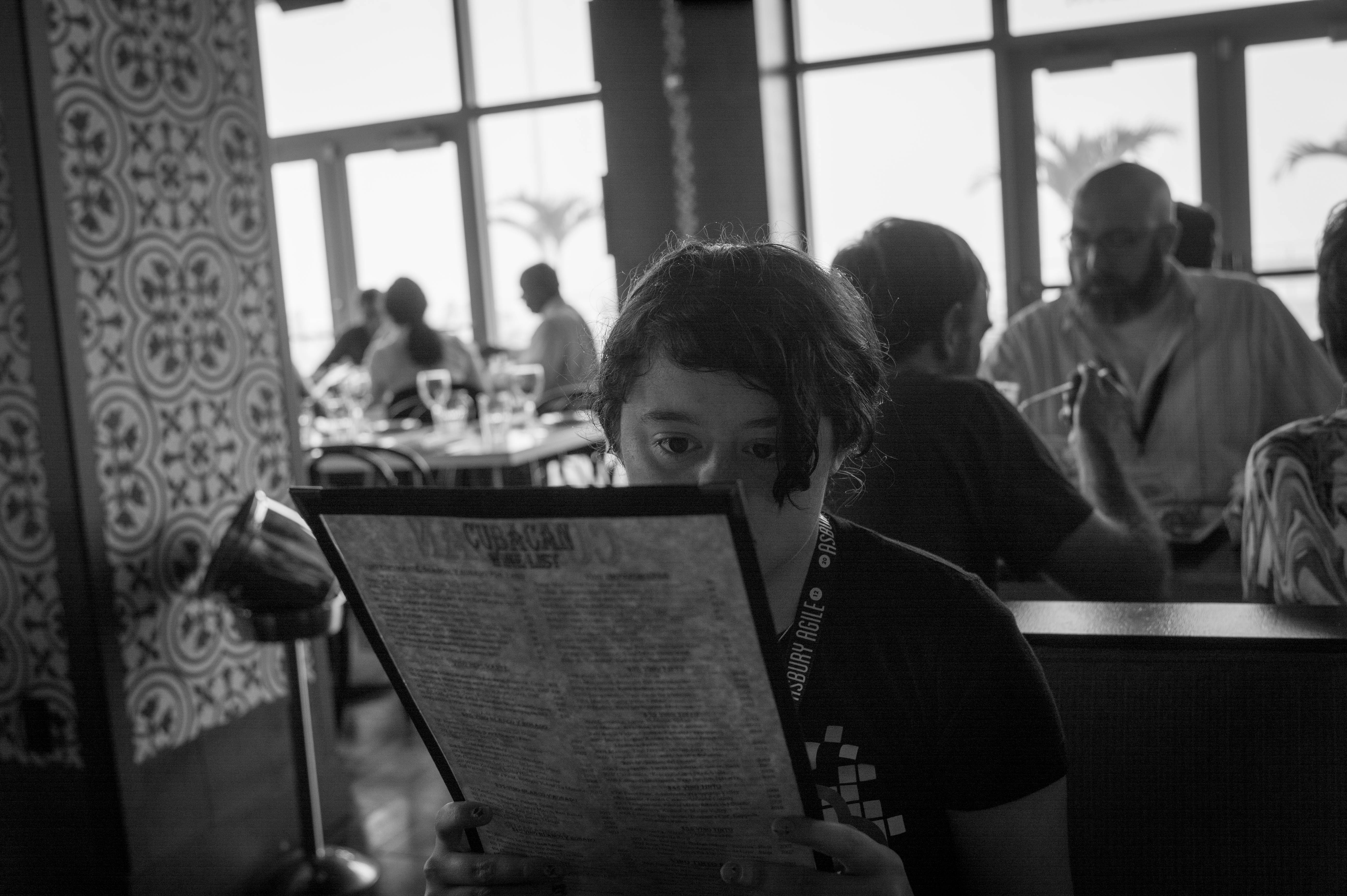 In this black-and-white photograph, a young woman sits absorbed in a menu, her furrowed brow suggesting contemplation amidst a lively restaurant setting. The soft lighting highlights her focused expression while the blurred figures of diners around her create a sense of bustling energy, contrasting her quiet moment. The composition draws the eye towards her, evoking a mood of introspection and choice in the midst of social activity.