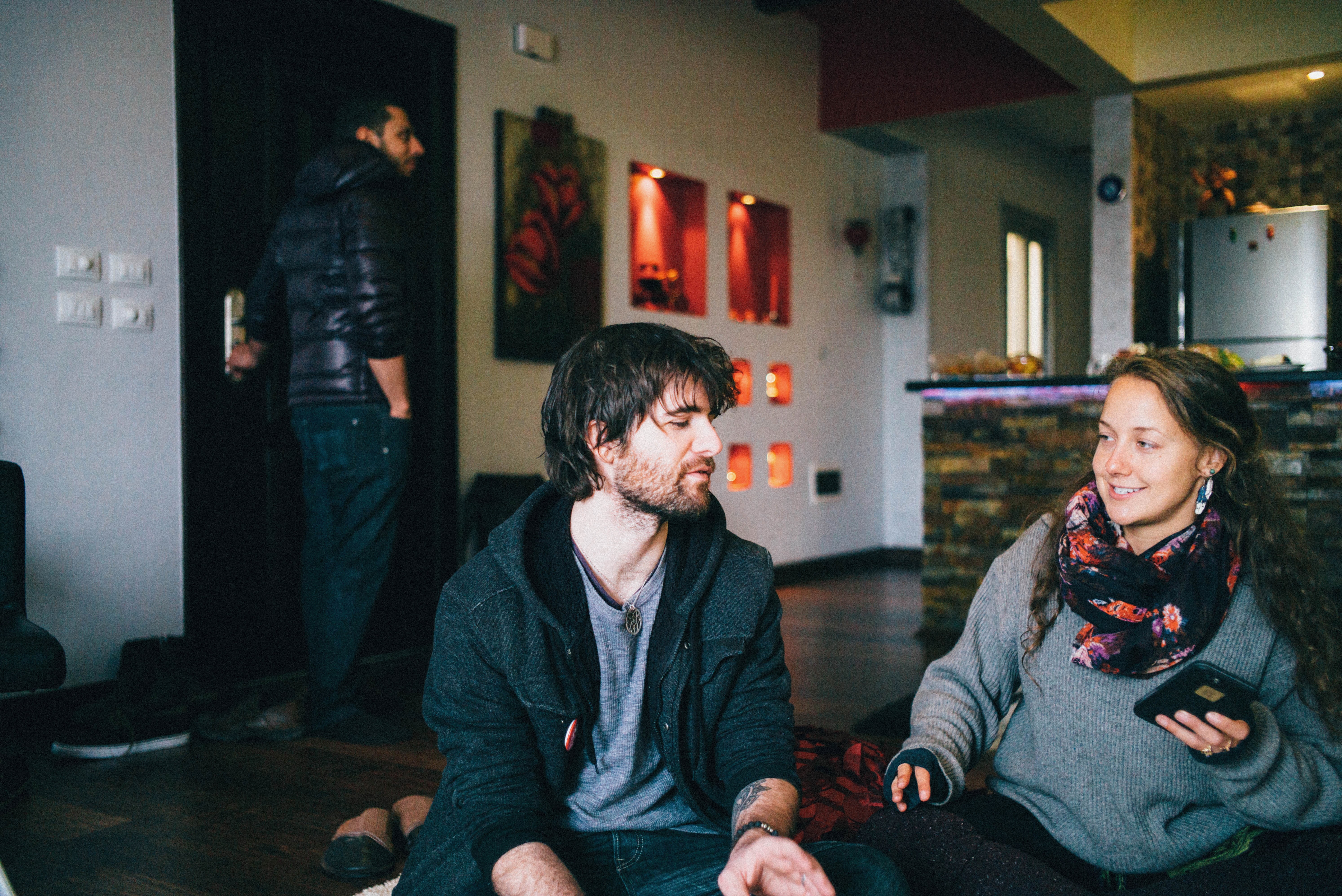 In a cozy indoor setting, two individuals engage in a light conversation, exuding warmth and comfort. The soft, natural light filters through the space, creating an inviting atmosphere that contrasts with the more distant figure leaning by the door, adding a hint of intrigue and separation.