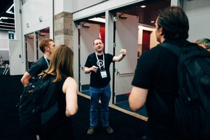 In a bustling conference setting, a group of four individuals engage in an animated discussion. The light filtering through the open doors creates a vibrant atmosphere, while the subject's expressive gestures imply enthusiasm and involvement, fostering a sense of connection among the attendees.