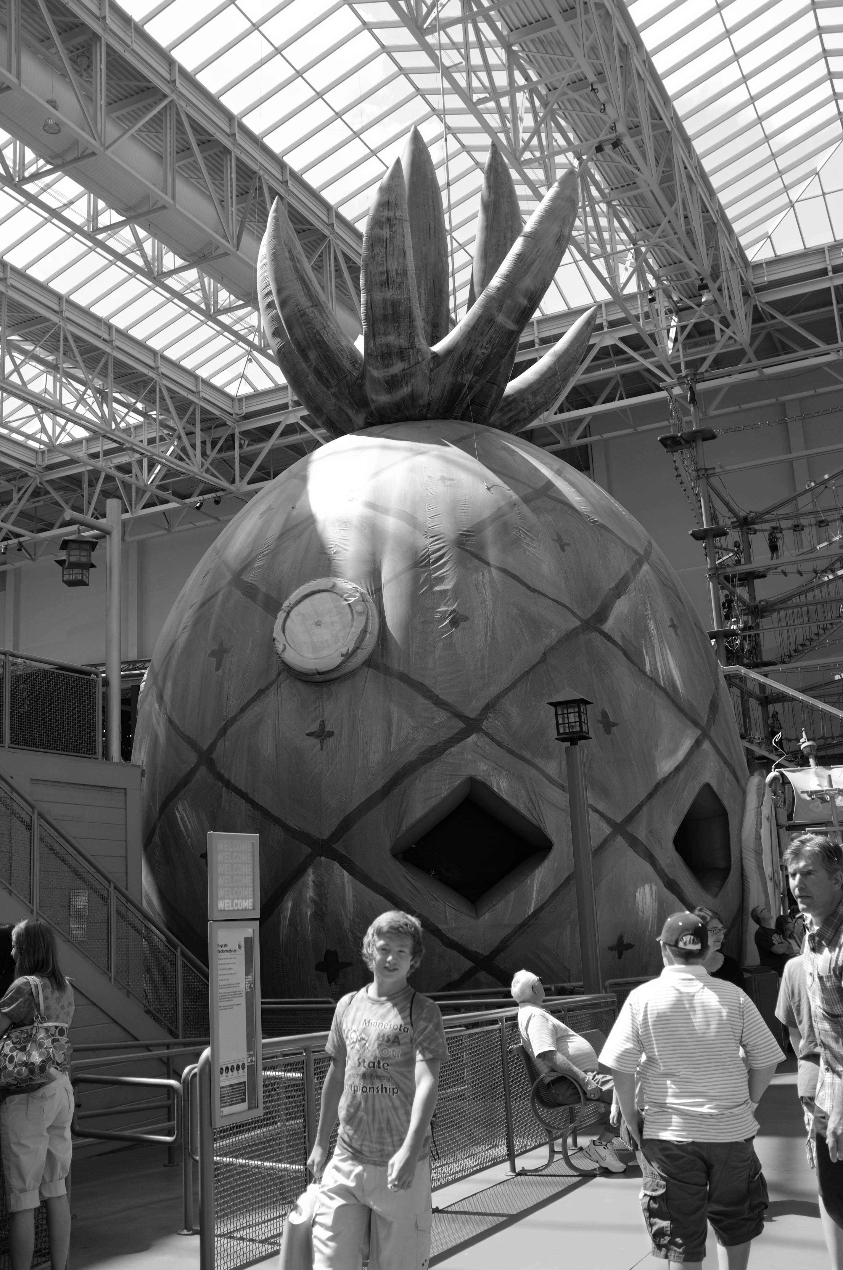 This striking black-and-white photograph features an oversized, inflatable pineapple structure at an indoor venue, juxtaposed against a backdrop of industrial architecture. The playful subject creates a whimsical atmosphere, with children and adults milling about, their expressions ranging from curiosity to amusement. Soft daylight streams through the glass ceiling, casting gentle shadows that accentuate the pineapple's quirky details and contribute to the lively yet surreal mood of the scene.