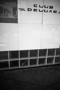 The photograph captures a fractured urban scene, focusing on the lower section of a building façade adorned with the name 'CLUB DEUXES.' The stark black-and-white composition emphasizes the contrast between the glossy tiles and the cracked glass blocks, creating a mood of neglect and abandonment, while reflections hint at life beyond the shattered surface.
