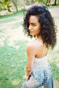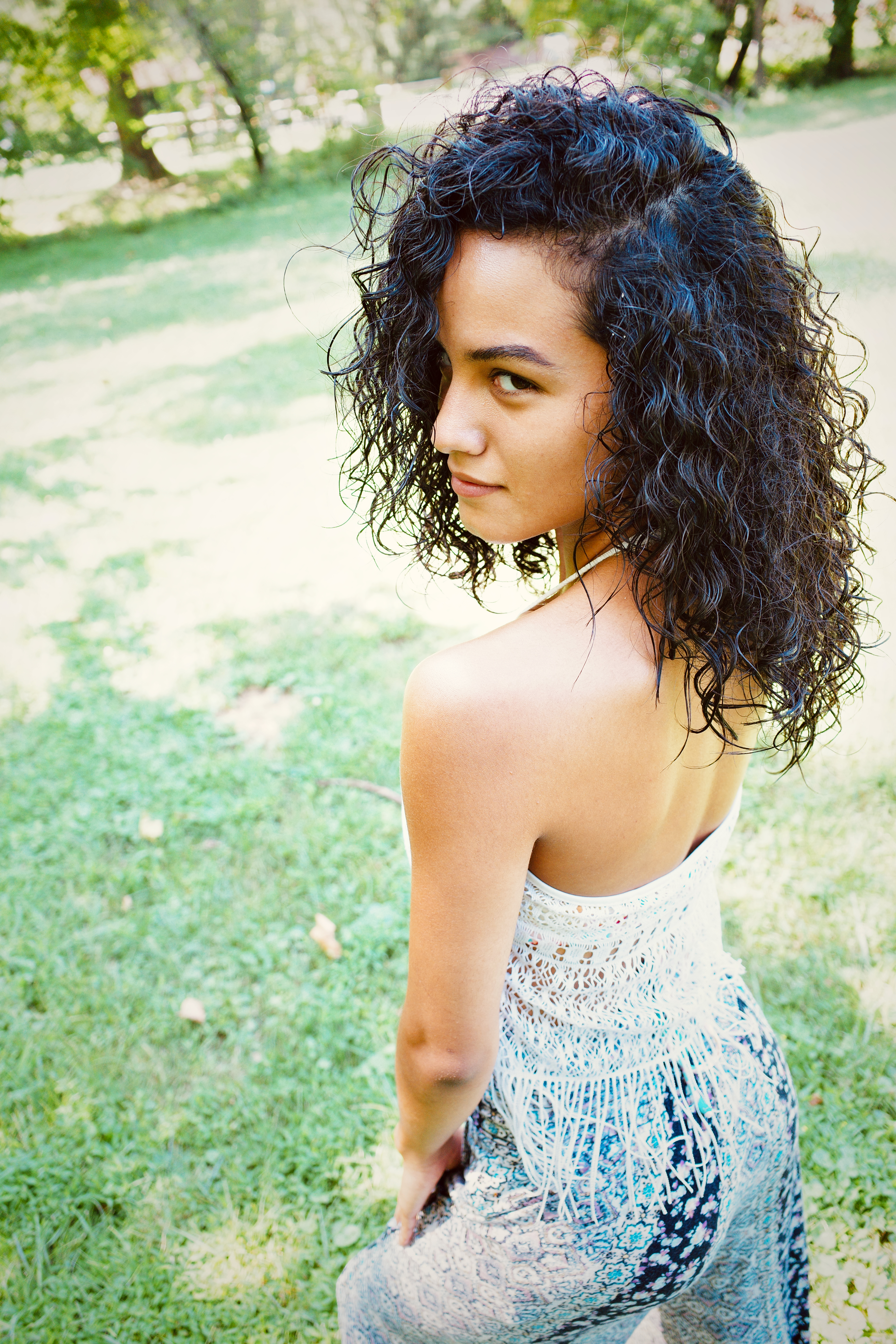 In this intimate portrait, a woman with curly hair glances over her shoulder, exuding quiet confidence and allure. The soft, dappled sunlight illuminates her skin and the verdant grass around her, creating a serene, almost ethereal mood. The composition captures both her elegance and the natural beauty of the surroundings, inviting the viewer into a moment of peaceful reflection.